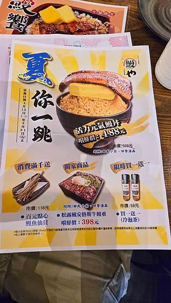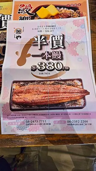 一本鰻:店員溫馨提醒:平常沒有活動時,一份一本鰻是760元,現在有做優惠活動:3/6~5/29每週三有半價優惠,梅子幫大家畫重點:只要380元就能品嚐到美味一本鰻,真的很超值。