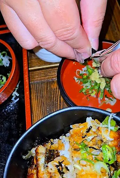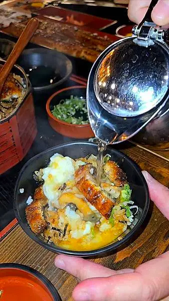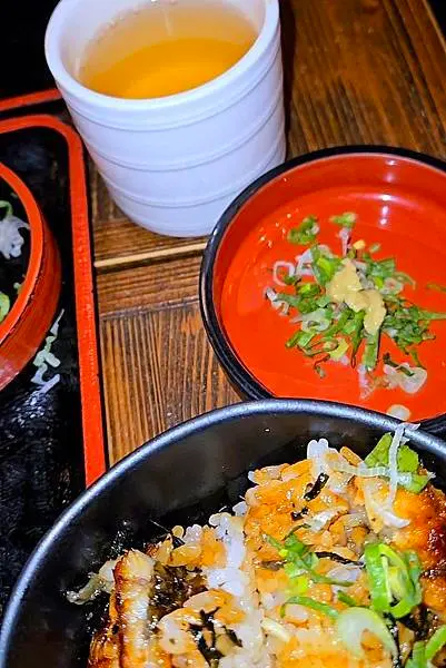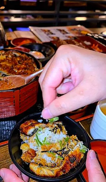 夢幻鰻魚桶飯3+1吃:店員開始慢慢敘述,可以先品嚐原味、其次加入蔥花與芥末,再搭配溫泉蛋(可以把蛋輕輕劃開,蛋液流出),可以品嚐濃濃蛋液與蒲燒鰻魚交織成的奢華柔嫩,最後,再加入高湯享受茶泡飯吃法,來來來,跟著老爺鏡頭一起一探究竟喔!