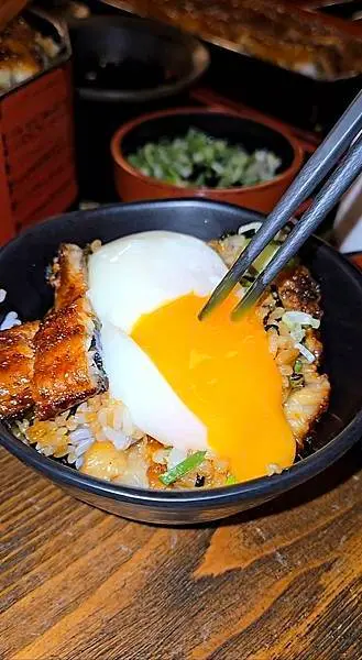 第三吃:倒入一顆溫泉蛋,用筷子輕輕慢慢劃開,讓蛋液緩緩流出,戳開後蛋液流出, 把蛋液跟鰻魚飯攪在一起吃起來更加美味,超好吃,梅子愛慘了
