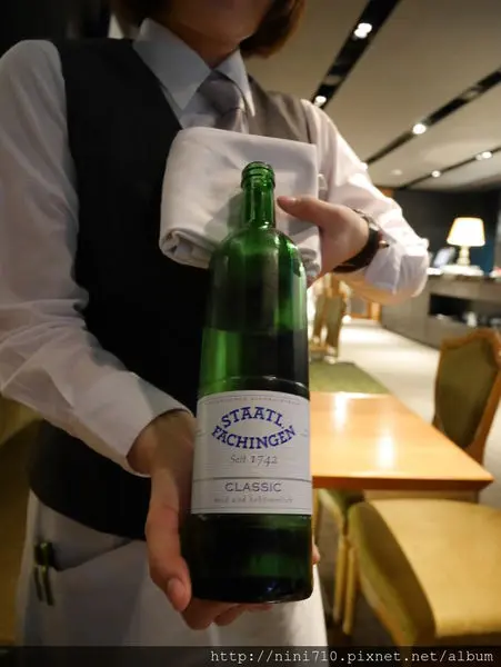 套餐包含無限暢飲的德國天然礦泉水,有兩款氣泡礦泉水可以選擇,staatl fachingen的綠色瓶與透明瓶,天然純靜如甘泉般美好的礦泉水,綠色瓶氣泡口感舒服平順,帶著微微的鹹,經適度冰鎮,可以使水、葡萄酒和食物的味道達到最完美的結合,透明瓶氣泡綿密強烈,喝起來清新舒暢,滋味甘甜無比