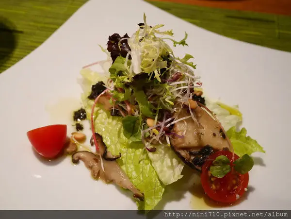 溫烤新社野菇沙拉佐法式松露油醋膏,屬於一道溫沙拉,增添了可使口感更鮮脆的松子與百合,濃郁的松露香氣,爽口溫暖