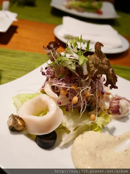 凱薩沙拉襯澎湖小卷及煙燻鮭魚,充滿海之味的一道鮮甜沙拉,Q彈無比的小卷冰的脆脆的,好好吃