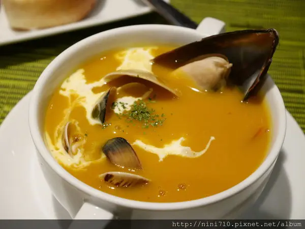 海鮮風味南瓜濃湯,滿滿都快溢出來的海鮮,有南瓜的田園香甜也有海鮮的鮮甜,混著鮮奶油沾的麵包吃,是我最喜愛的吃法