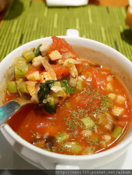 口味酸甜走清爽路線的番茄蔬菜清湯,湯匙一撈也是滿滿的料,這道結合多種蔬果熬煮而成的百匯蔬菜清湯博得小花與Kimi哥的喜愛