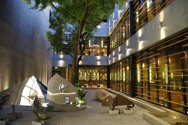 由前方的建築物一旁的小道走到後方,就是這個饒富禪風的庭園,高聳的樹木,晚上多了燈光的配置,很難想像這是位於城市之中。