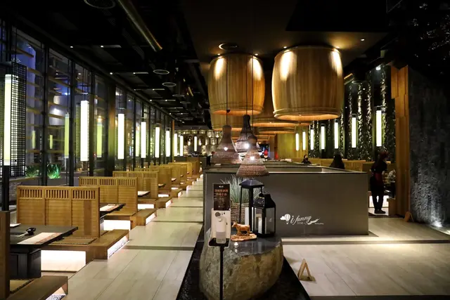 沿著庭園一旁的座位區,則是將座位向下移,更有日式榻榻米的氛圍。而挑高的落地窗,照映出的日式風情,更是別有一番風味。