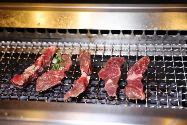 雪花牛的油脂最多,烤盤滋滋作響,並傳來美味的香氣。