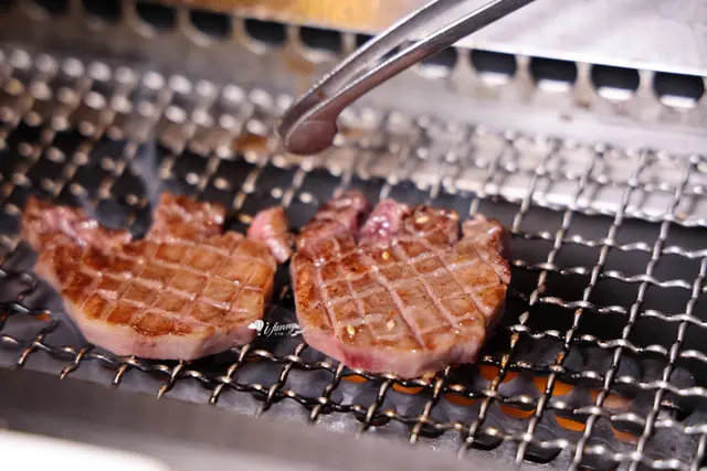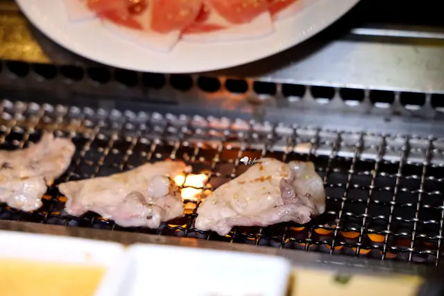 因為太想吃牛舌而加點,厚實的牛舌真的有如芒果一般的井字切法,先看外表就好吸引人!顧慮我們的烤功不佳,因此服務人員主動幫我們烤牛舌。