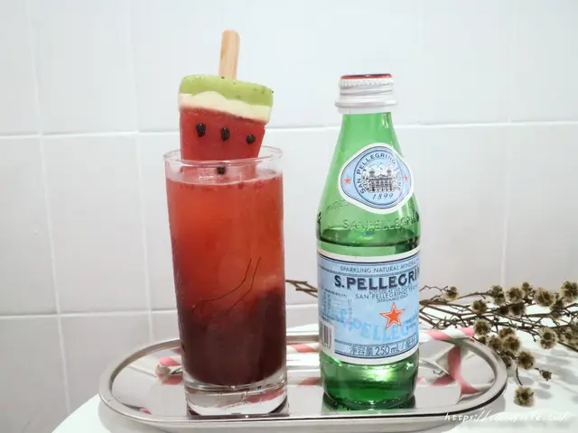 除了欠打奶酪外,這次推出的氣泡飲也超吸引人的,這款西瓜玫莓是莓果醬搭配玫瑰的組合,剛開始喝玫瑰味還蠻香的,攪拌之後莓果味會搶過玫瑰的香氣,上頭還有一支超可愛的西瓜冰棒,西瓜皮是奇異果搭配優格,西瓜籽是巧克力唷