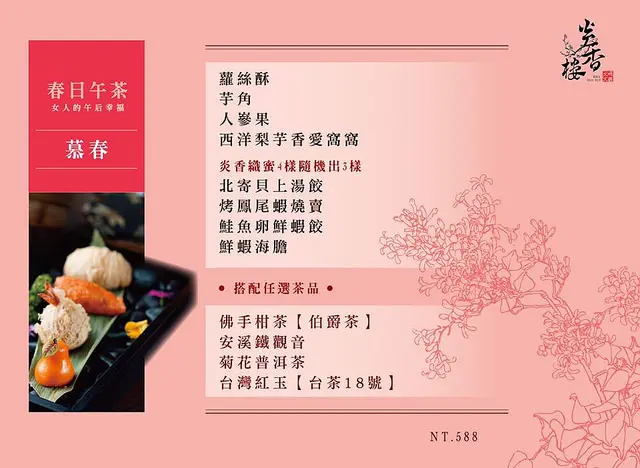 慕春下午茶套餐,共七道港點,再搭配任選茶品(喝到飽)一套是588元