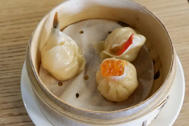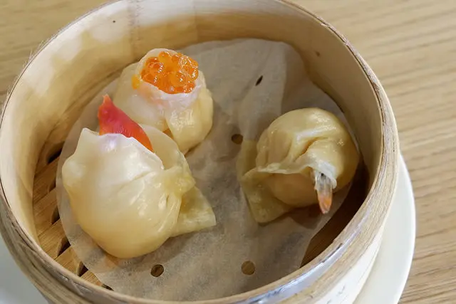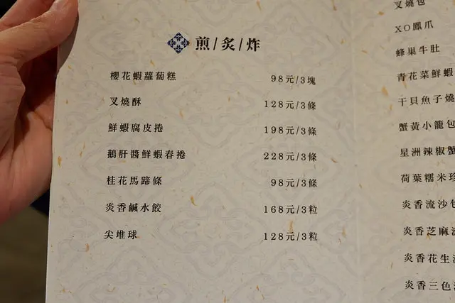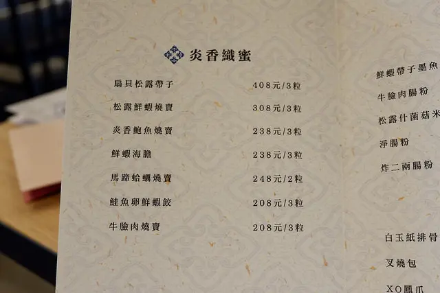 炎香織蜜系列裡的四樣當中隨機出三樣,今天吃到的應該是北寄貝上湯餃、烤鳳尾蝦燒賣和鮮鮭魚卵鮮蝦餃,他們家的皮雖厚卻很有勁
