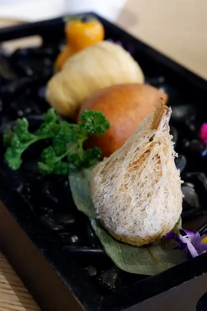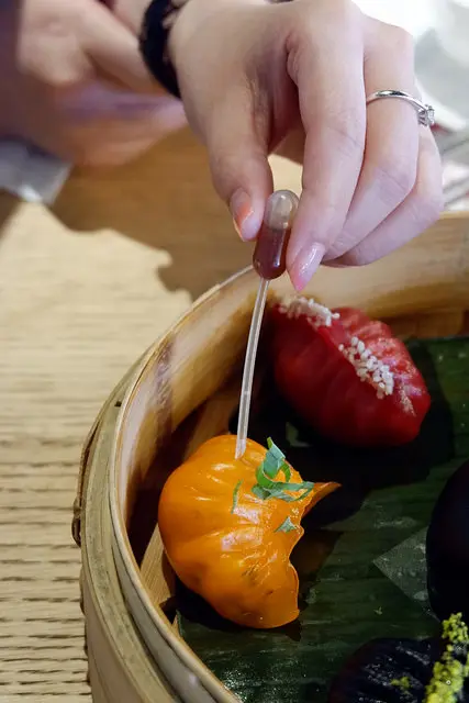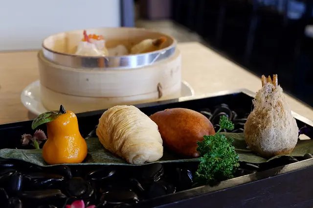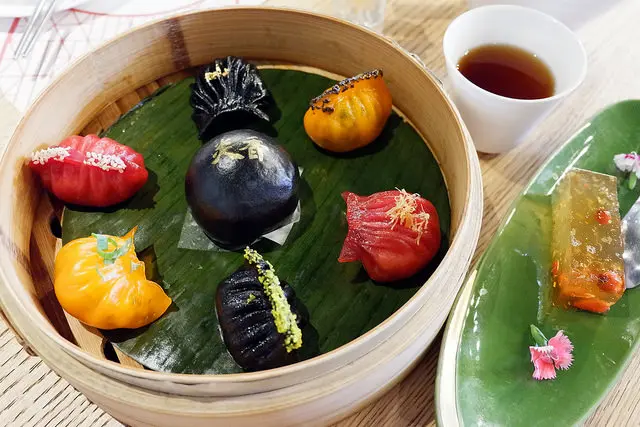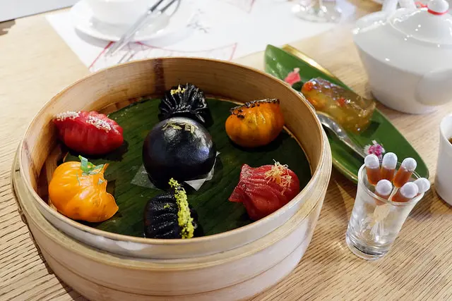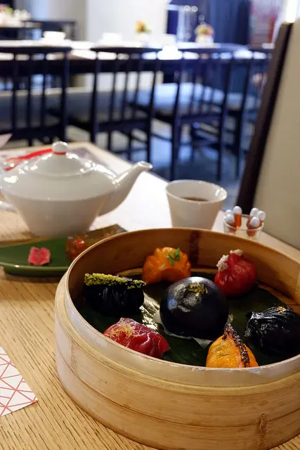 絢彩下午茶套餐餃子的顏色取的好優美,遠山如黛,六宮粉黛無顏色的黛,黛餃(黑色的餃子),原來形容黛色是黑色當中帶點墨綠色,花枝漿、蘆筍跟鮮蝦餡吃起來清脆爽口,金餃,當然就是黃顏色的那個,包的是雪菜與鮮蝦餡,赤餃,赤色就是紅色,紅色的餃子裡多了些海味,包著西芹、白筍、干貝絲與鮮蝦餡,三種餃雖都是以鮮蝦餡為主,但各有精采與特色,比起傳統油膩膩的港點我更愛這種添加很多蔬菜在裏頭的清爽感,重點是皮Q的好好吃,既使冷掉一些些吃依然Q中帶彈