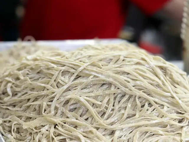 攤頭上的意麵一看就覺得很新鮮的樣子。這是製麵時,不加一滴水,採加蛋黃和高筋麵粉揉和而成,因此在還未煮熟前,呈現微微的黃色。