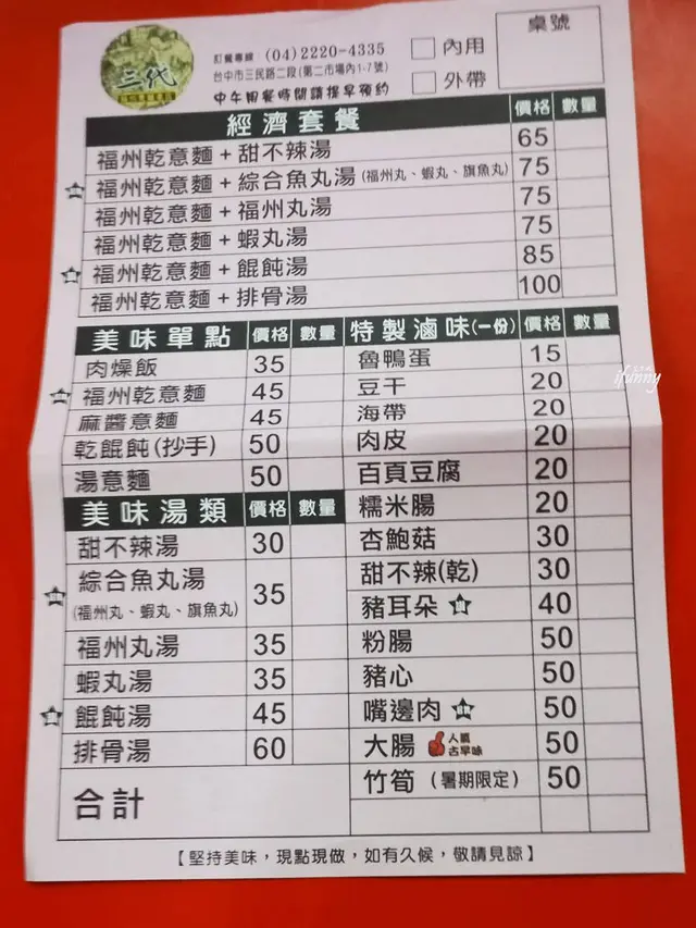 這是三代福州意麵老店的菜單(2020.03),供應的餐點就是意麵、湯品及各式小菜。