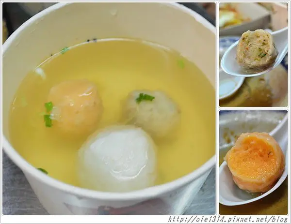 疑?意麵忘記拍了!?哈~顧吃忘記了啦意麵吃起來還ok啦,不是雷但也不能給讚的中等美味 ~(意麵買了1碗)還是來介紹他們家的綜合魚丸湯吧!!綠色的是旗魚丸吧!!吃起來雖然有點嗆嗆的,不過香氣十足啊。而橘色的蝦丸吃起來就比較普通,跟一般市場上買的蝦丸味道相去不遠,所以沒啥好推的囉~~(綜合魚丸湯買了兩份)