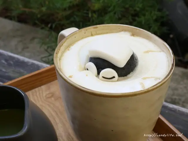 可愛的溫泉小黑棉花糖,糖糖選了焙茶拿鐵做搭配,焙茶拿鐵是無糖的,喝的時候將溫泉小黑放在上頭就像在泡溫泉一樣,畫面看起來超療癒的,而且他還會隨著重量慢慢沉下去,最後還來個倒頭栽呢