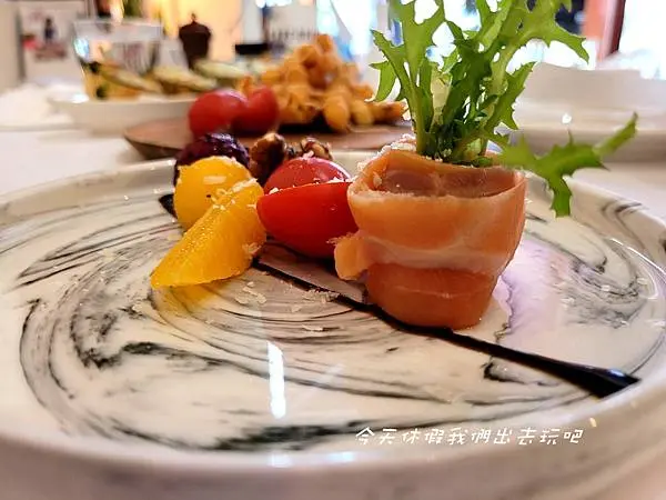 *佐餐酒*主廚濃湯*青醬焗麵包*每日主廚推薦甜點*冷前菜-煙燻鮭魚花