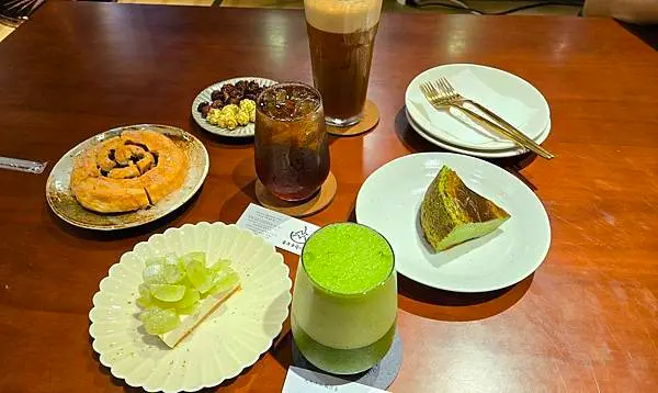 就在與老爺話家常時,桌上餐點一一出爐:西西里咖啡、小山園抹茶乳酪蛋糕、綠葡萄北海道生乳酪蛋糕、阿法其朵、小山園抹茶-甘蔗青嵐、玫瑰荔枝糖霜肉桂捲,等我們慢慢品嚐後,再與大家分享簡單的口感心得。