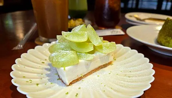 綠葡萄北海道生乳酪蛋糕:哇!當這甜點呈現在我眼前時,讓我們倆非常驚豔,搭配鮮甜多汁的綠葡萄和生乳酪蛋糕,每一口吃起來,很清爽甜而不膩,是個很療癒又讓味蕾非常驚喜的甜點!