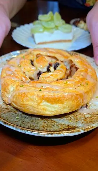 玫瑰荔枝糖霜肉桂捲:梅子一口接一口時,這肉桂捲外皮超酥脆內餡鬆軟,玫瑰香瀰漫在味蕾香氣十足,裡面還包覆著許多葡萄乾、核桃,肉桂捲蓬鬆酥軟的口感,再搭配甘蔗青嵐,梅子超喜歡這樣的組合,超級搭。