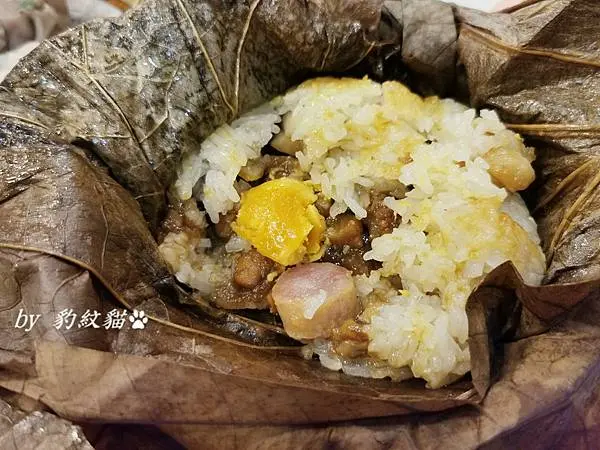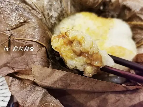 荷葉包裹住的米粒口感軟糯,內餡豐富的食材味道整個融合,淡雅的鹹香滋味迴盪,平日不太愛吃米食的我,馬上變節,兩三下就吃光光,自己也嚇了一跳!