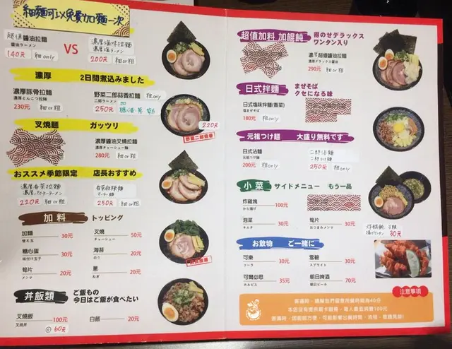 拉麵都可以外帶,麵條有分細麵和粗麵兩種,細麵可以免費加麵一次,不過有的口味限特定麵種,像是醬油拉麵只限細麵