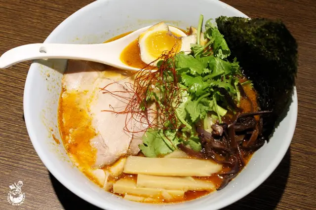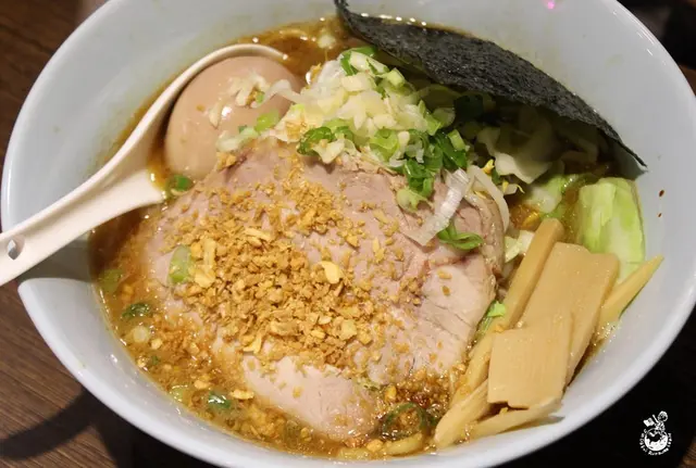 好友表示湯的濃度很夠但不會稠 ,蒜香味很足,和帶點魚介味道的湯頭很搭,整體喝起來鮮甜沒有腥味,香氣的平衡感處理得很好,若是不敢吃蒜的人就不建議點野菜二郎的檯囉!