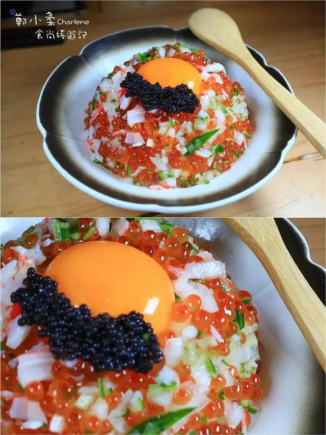 綴以豪氣的黑色魚子醬,最棒的吃法就是,拌一拌後,用木湯匙,