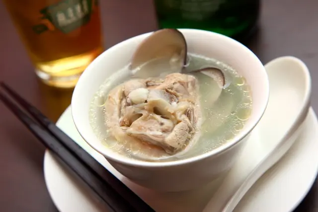 這鍋湯是用蒜頭、薑片跟蛤仔加上仿仔雞腿同燉煮,蒜頭完全煮的軟綿,蒜頭味道完全滲入湯中,每一口都能喝到滿滿的蒜香及蛤蠣鮮味,仿仔雞堅持每日直送的溫體雞,仿雞腿肉吸飽了湯頭的鮮味,肉質Q軟細緻