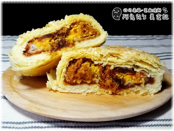 外皮的部分比較像是中式月餅餅皮,上頭刷上蛋液,呈現金黃的色澤