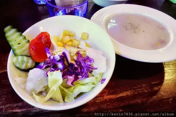 餐點前的濃湯與沙拉,沙拉口味比較大眾化,梅子個人比較喜歡濃湯的濃稠感,濃稠適中剛剛好,來這裡我總把濃湯喝光光