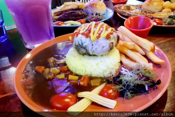 我總愛把咖哩淋在飯上,這樣吃超過癮,粒粒分明好吃的白飯搭上咖哩真的超搭,這切開會噴汁的牛肉堡,讓我大口吃肉,大口吃咖哩