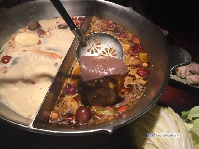 點一個鴛鴦鍋,白鍋是麵包豆腐白湯鍋,紅的是無老辣香鍋。辣鍋對愛吃辣的朋友應該會不夠辣,可請他們加辣。