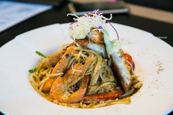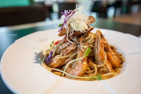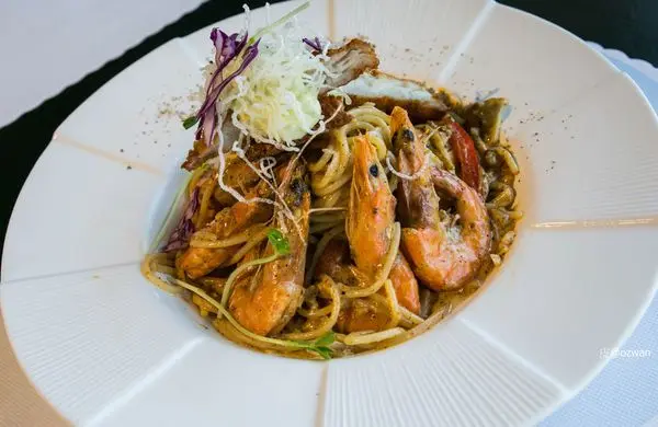 【奶香鹹蛋鮮蝦佐香酥魚義大利麵】($280)