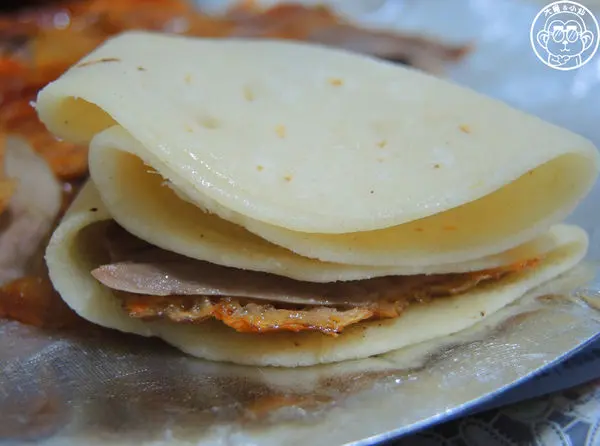 將鴨肉和鴨皮夾進餅皮中,一口可以吃到不同層次的美味