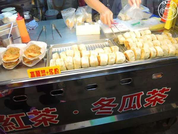 水煎包(12元,買十送一),還有賣紅茶與蔥抓餅(25元)
