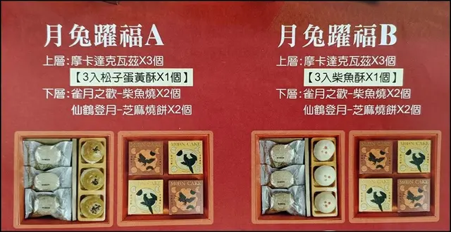 這一款月兔躍福A禮盒,上層有松子蛋黃酥、達克瓦茲;下層有柴魚燒、芝麻燒餅。