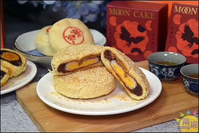 切開來看內餡好豐富,從外而內分別是鹹中帶甜的肉鬆、綿密細緻的紅豆沙、Q彈麻糬、以及鹹香蛋黃,再加上燒餅上有滿滿的白芝麻,一整顆用料很實在。