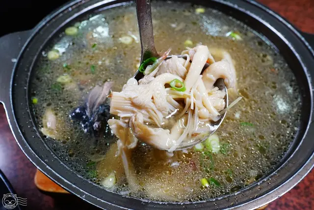 滿滿都是料的鮮菇雞湯,光菇菇就有杏鮑菇、秀珍菇、金針菇,搭配新鮮雞肉一起下鍋,隨便一舀都是滿勺的料,很瓜張。