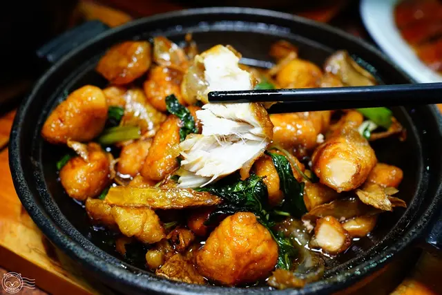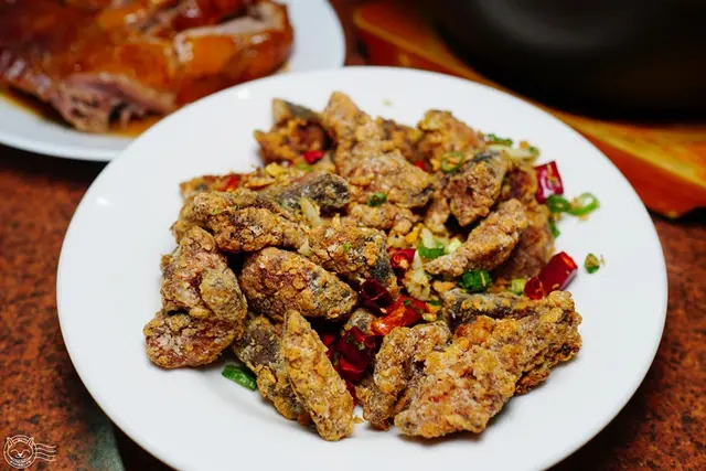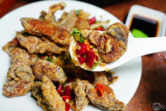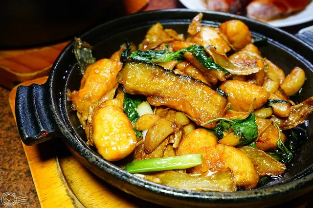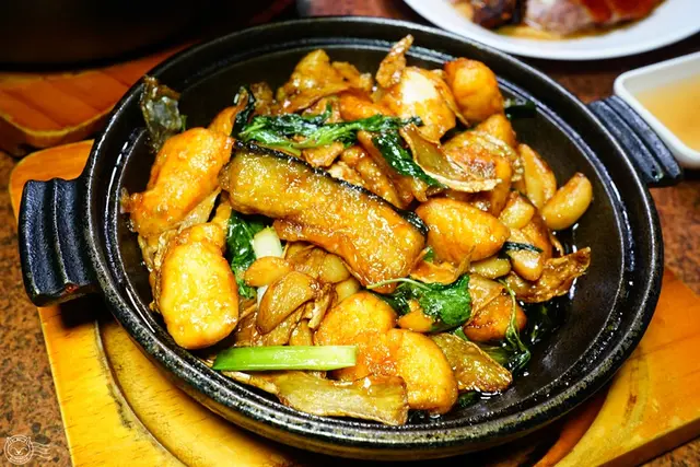 店家自己製作的紅燒鰻,鰻魚去骨後,以紅糟醃漬入味,裹薄粉炸到外皮酥脆,再大火快炒蔥、蒜、蒜酥、辣椒等辛香料。