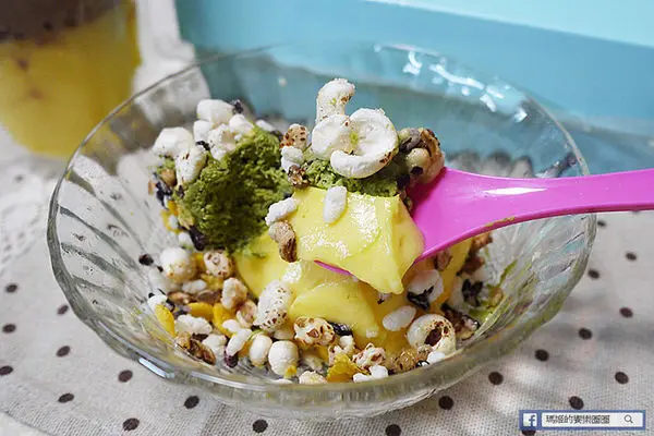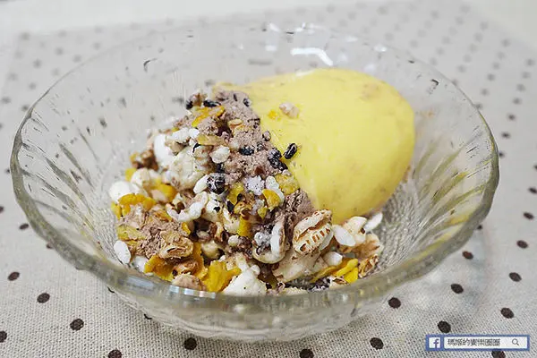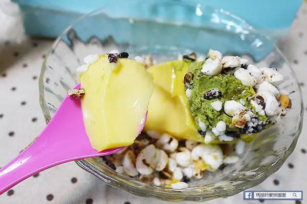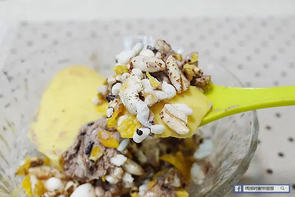 因為要拍照我還是放入碗內一探究竟,在每一款的布丁上層都放上小火慢炒過的米果,淋上些許焦糖,中間那層是慕斯,最底下則是布丁