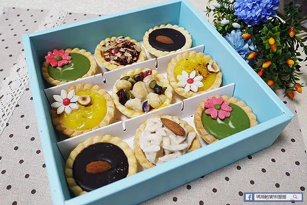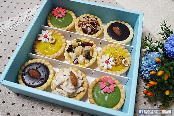 裡面是有杏仁巧克力塔、巧克力塔、抹茶塔、夏威夷豆塔、蔓越莓脆塔、檸檬塔等六種口味組合而成的九宮格小塔,每一個都是小巧可愛的樣子