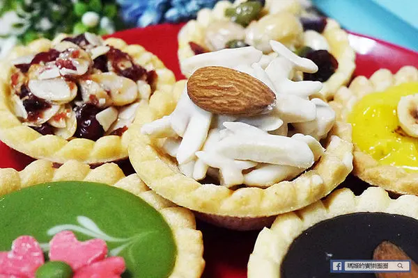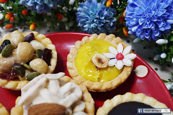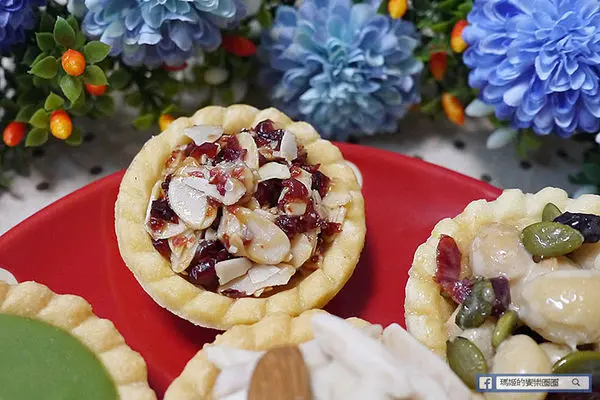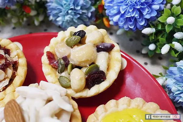 「夏威夷豆塔」進口澳洲夏威夷豆,加上南瓜籽和蔓越莓果乾,以薄薄的糖衣融合在一起,嚐起來滿口堅果香氣,甜脆不膩