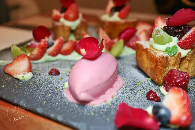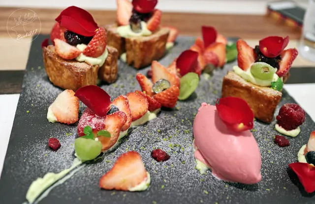 酥香的千層,擠上獨特的羅勒卡士達醬,香甜柔順的卡士達醬中透著淡淡的羅勒香氣實在特別又能降低吃太多甜點的膩感,整體別出心裁又有層次!搭配許多的葡萄、草莓、開心果碎、玫瑰花瓣與草莓覆盆子冰淇淋,賞心悅目。