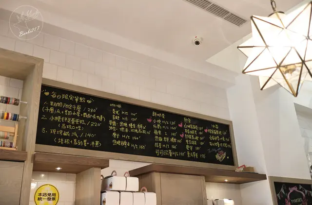 長黑板上寫著許多特色餐點,例如使用當季水果的期間限定千層派、舒芙蕾蛋糕、鹹派與各式飲品。