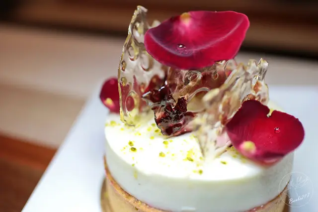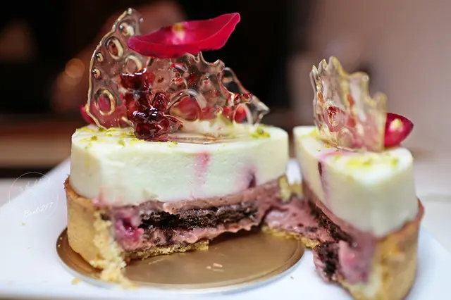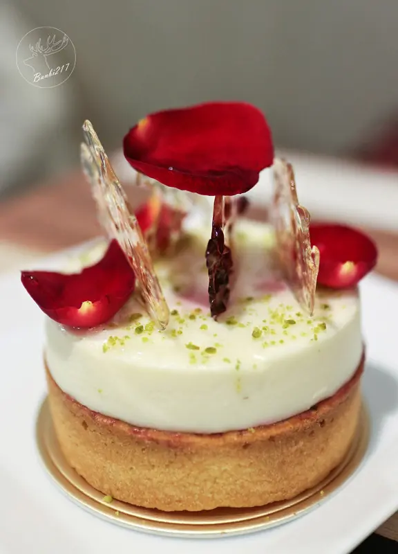 玫瑰花與透明的糖片站立在白巧克力荔枝慕斯凍上方,撒上開心果碎屑,底下鋪著酥塔皮內夾雜著覆盆子內餡,荔枝香與玫瑰香氣讓人感到高雅,而覆盆子的酸味能讓白巧克力荔枝慕斯凍的甜度來的溫和些。