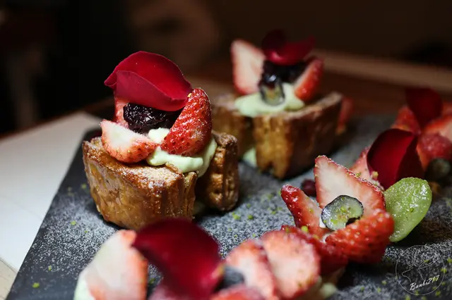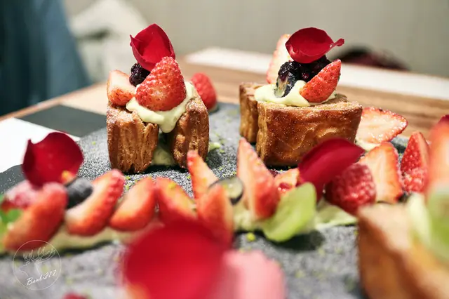 此款甜點名為「曖昧」,浪漫的玫瑰花、開心果碎與糖片、白巧克力荔枝慕斯凍,像是穿梭在花園般。本以為這樣就結束,沒想到塔皮內夾雜著覆盆子內餡,時而甜蜜時而微酸,有點明朗卻又暗藏情感如曖昧一樣。
