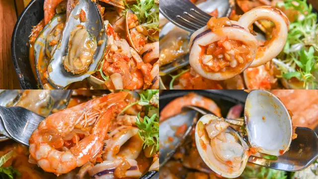 地中海海鮮有蛤蜊、淡菜、蝦子、中卷這四種海鮮搭配特製醬汁拌炒,所有新鮮的海鮮都充分吸收香辣過癮但不死辣的海鮮醬,讓人很容易一口接一口,越吃越涮嘴,我自己不太愛吃淡菜,但他們的淡菜是好吃的,沒有土味。