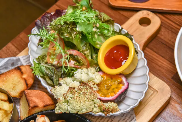 胡麻口味的沙拉鮮嫩可口,還有烤過以後更好吃的花椰菜及百香果,基本上吃完這一份餐點很有飽足感!