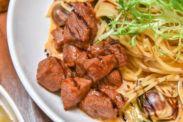 肉量滿滿的骰子牛淋上紅酒醋,看起來更美味~骰子牛肉質非常軟嫩多汁,咬下真的有爆汁感,同時享受得到濃郁肉香。